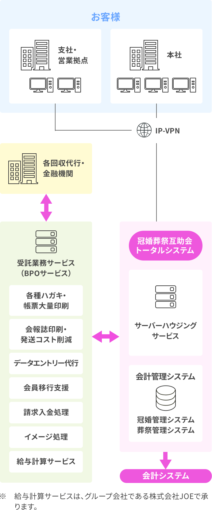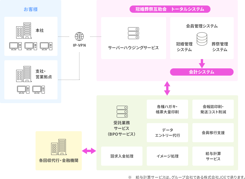 互助会様の基幹業務である、会員管理、冠婚・葬祭業務をはじめ、大量印刷、イメージ処理などのアウトソーシングや