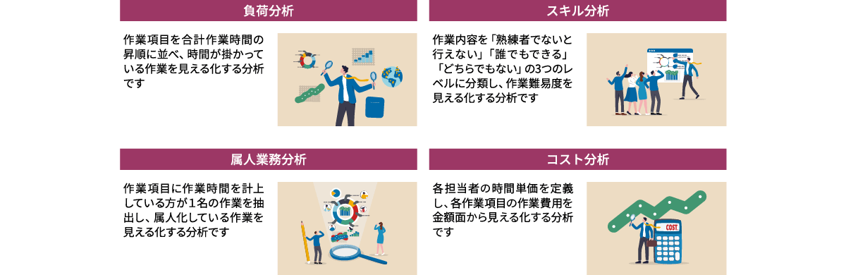 負荷分析、属人業務分析、スキル分析、コスト分析の4つの切り口で現行業務を見える化し、分析結果をご報告いたします。
